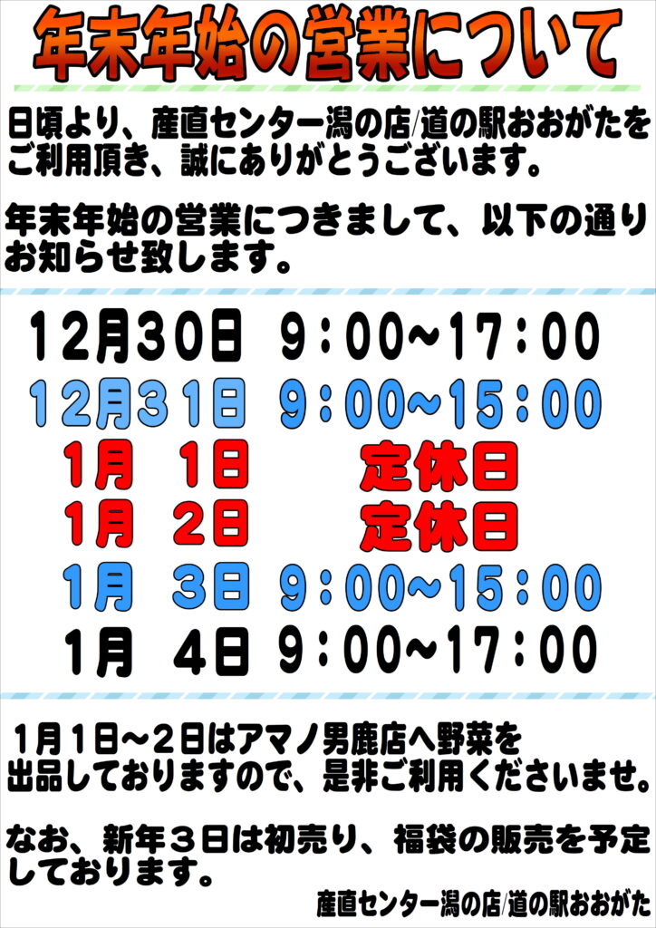 年末年始の営業についてお知らせいたします。